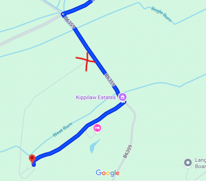 Please be aware that Sat Nav will take you to the back entrance of Kippilaw and you should take the second entrance. Take the second right like the image below